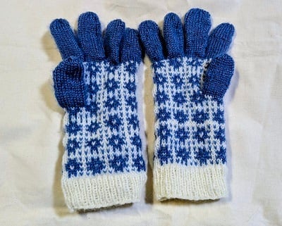 ハンドメイド雑貨 手編み手袋 tb.no.94、縦25㎝、横9.5㎝、伸びるのでフリーサイズです。青のモヘアの糸と白で編み込み模様で編みました。